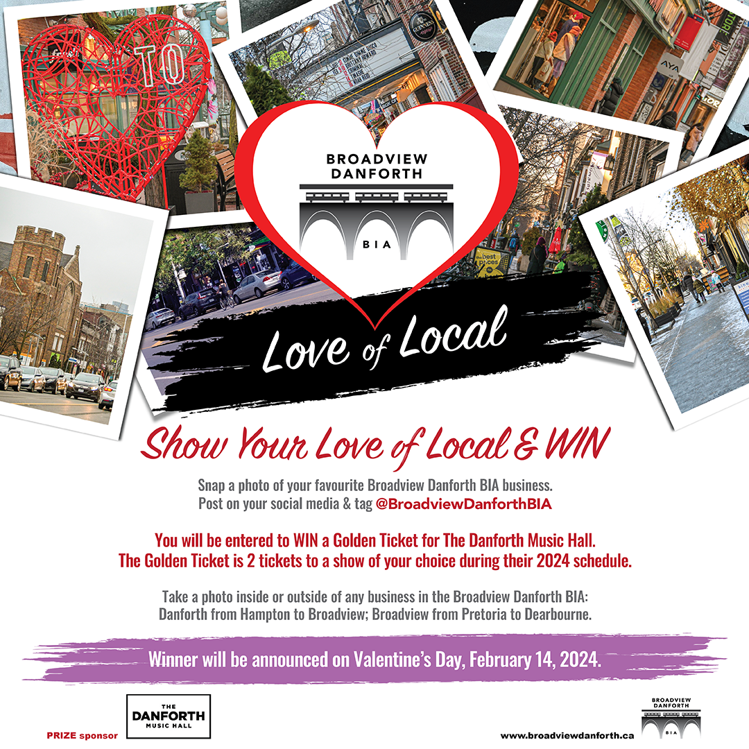 Starting today (Feb. 2) we're asking your customers to take a photo of their favourite BIA business and post it to their socials and tag us @BroadviewDanforthBIA. Once they do this they will be entered to win a really great prize: A Golden Ticket to our Danforth Music Hall. This golden ticket gives the winner 2 tickets to a show of their choice this year! Huge thanks to Cameron Wright, Music Hall GM and BIA Board Member, for generously donating this prize.