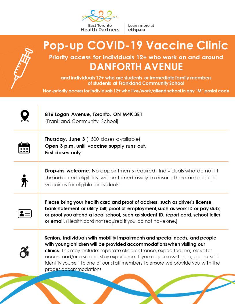 East Toronto Health Partners will be operating a pop-up vaccine clinic on Thursday, June 3 at Frankland Community School (816 Logan Ave) that will give priority access to individuals 12+ who work/live on or around Danforth Avenue. The clinic opens at 3 p.m. until vaccine supply runs out.